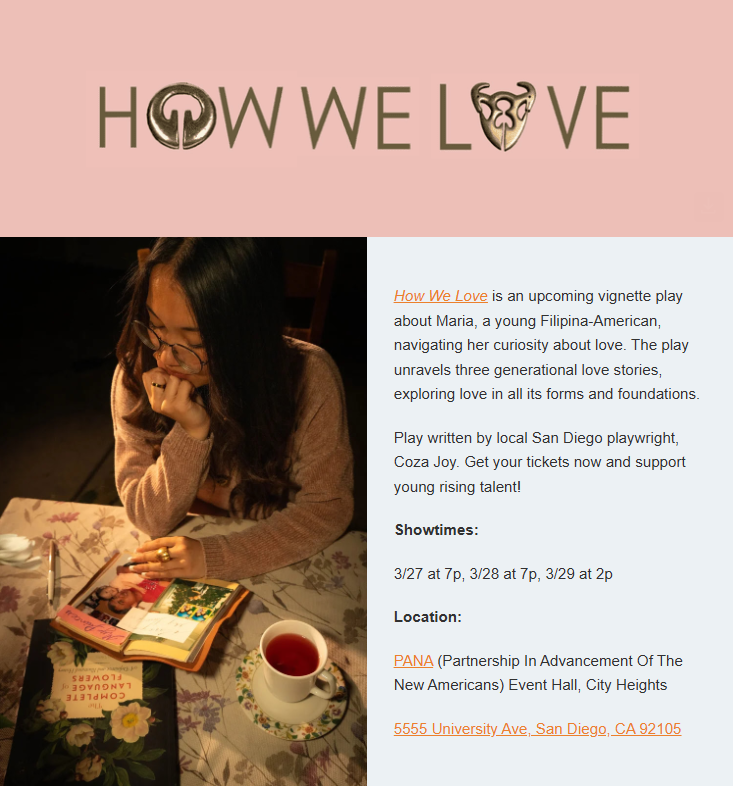 The production follows Maria Love Reyes, a young Filipina American navigating her curiosity and observations around love through three intergenerational stories inspired by Coza’s own experiences. But beneath the romance and giddiness is a deeper exploration: not just what love is, but how we learn to recognize it in its many forms.