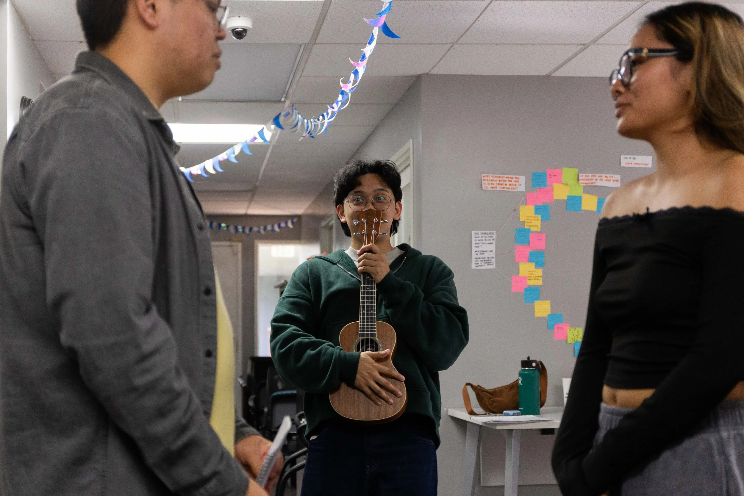 Music plays an important role in the play, inspired in part by harana, a traditional Filipino courtship practice where someone would serenade the person they love. While the traditional version involves singing outside someone’s window, Coza reimagines it through a modern lens.