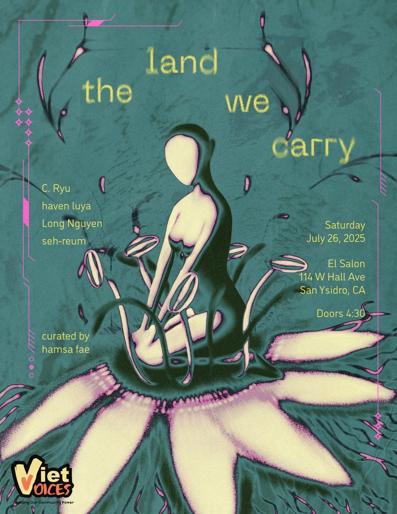 On Saturday, July 26, Viet Voices is hosting its inaugural one-day performance art festival, which features the works of fellows selected for the first AAPI Emerging Artist Fellowship, co-founded by Viet Voices and local artist and curator hamsa fae. the land we carry will take place at El Salon, a repurposed Catholic church in San Ysidro near the U.S.–Mexico border. A meditation on the intersections of diasporic memory, queerness, and spiritual inheritance, artists will express live and non-live performances that offer portals to worlds re-imagined–where the subconscious reveals truth for community activation. hamsa fae, who will also be offering a performance workshop during the festival that engages the audience in creative expression, shared some insight into what we can look forward to this upcoming weekend.